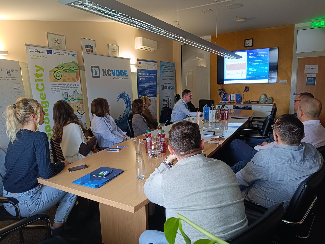 U nastavku programa održan je posjet tvrtki Koprivničke vode d.o.o., gdje je sudionike pozdravio direktor Zdravko Petras te predstavio djelokrug rada i ključne aktivnosti. Rukovoditelj Sektora centralni laboratorij i zahvaćanje vode Damir Ruk je prezentirao projekt Sponge City, koji predstavlja inovativni pristup upravljanju oborinskim vodama u urbanim sredinama. Voditelj Službe za agrometeorologiju Državnog hidrometeorološkog zavoda, Mislav Anić, prezentirao je projekt Prognostički alati za ublažavanje združenih posljedica suše, toplinskih valova i požara na području središnje Europe - Clim4Cast. Partneri su tom prilikom posjetili i pokusni kišni vrt koji omogućuje praćenje cjelovite bilance mikrociklusa vode u prostoru atmosfera te demonstrira praktičnu primjenu prirodnih rješenja u povećanju otpornosti na klimatske promjene.