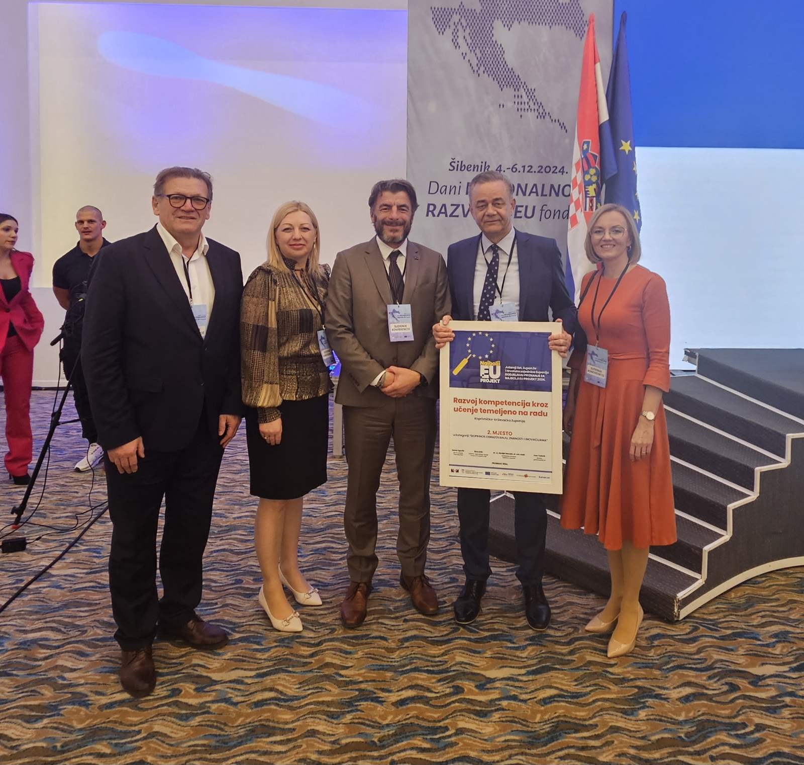 Projekt „Razvoj kompetencija kroz učenje temeljeno na radu“ osvojio je drugo mjesto u kategoriji Doprinos obrazovanju, znanosti i inovacijama na natječaju za izbor najuspješnijih projekata EU u Republici Hrvatskoj. Nagrada, koju je uime Koprivničko-križevačke županije preuzeo župan Darko Koren, dodijeljena je jučer u sklopu konferencije "Dani regionalnog razvoja i fondova EU" koji se održavaju u Šibeniku.