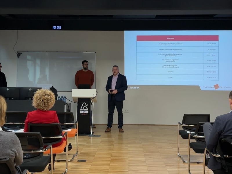 Zamjenik župana Mario Rajn te Algebrini stručnjaci Ema Menđušić Škugor, Anamarija Mladinić i Zlatan Morić, raspravljali su o odnosu tvrtka prema umjetnoj inteligenciji, kibernetičkoj sigurnosti, zaštiti podataka te pružili stručne odgovore na postavljena pitanja iz publike. Događanje je zaključeno raspravom i razmjenom iskustava uz zajednički zaključak kako su kontinuirana edukacija i suradnja ključna za jačanje otpornosti organizacija u digitalnom okruženju.